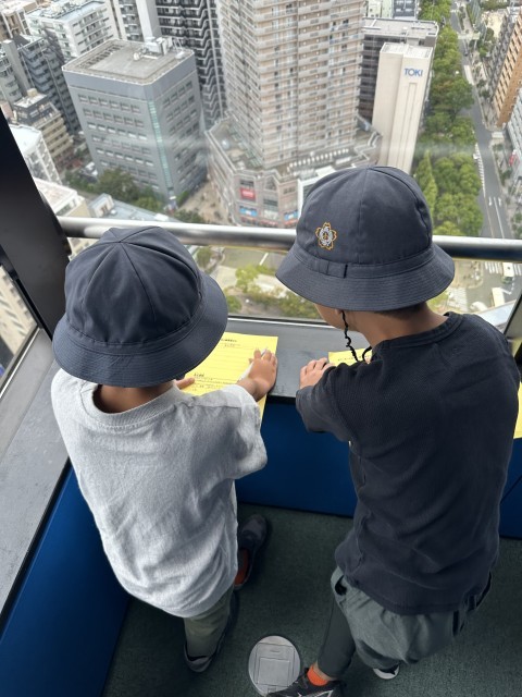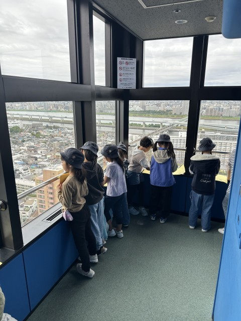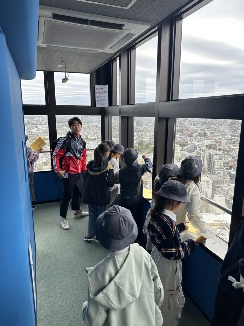 子ども達は展望塔に到着し、周りの方角を確認したり、建物を探したりしました。