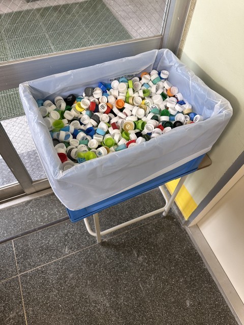 特に5年生の下駄箱近くに設置された回収箱は、キャップでいっぱいになりそうなほど!