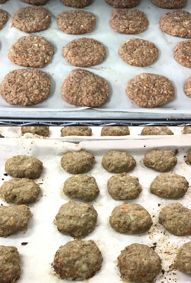2枚目写真の上半分は成形をして焼く直前のハンバーグです。オーブンで焼くと下のようにこんがり焼き目がつきます。
