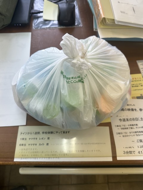 11月11日(火)、ある先生がビニール袋いっぱいのペットボトルキャップを学校に届けてくださいました。
