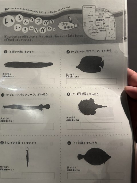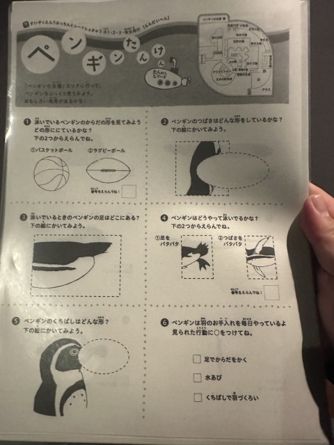ペンギンの体の特徴や魚の生態について、熱心に調べながら観察を進めています。