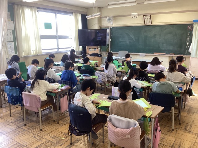 11月19日(火)5校時、3年生は、展覧会に向けて使う葉っぱを制作中です。