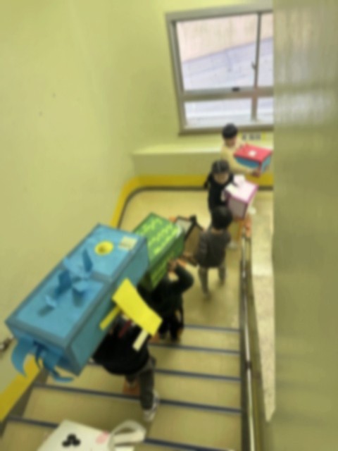 11月25日(火)1校時、展覧会に向けて、2年生も自分たちの立体作品を体育館へ搬入しました。