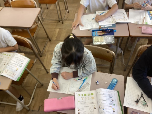 子ども達は、コンパスの使い方を確かめながら、線の長さや角度に気を配り、集中して丁寧に作図していました。