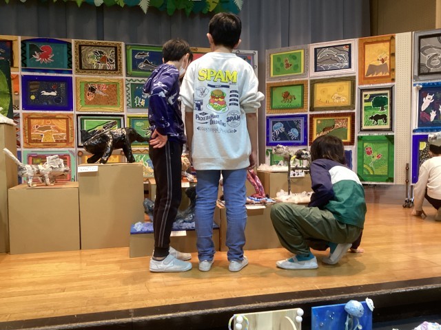 各学年の作品や、みんなで力を合わせて作り上げた共同制作の作品などを、じっくりと時間をかけて鑑賞していました。