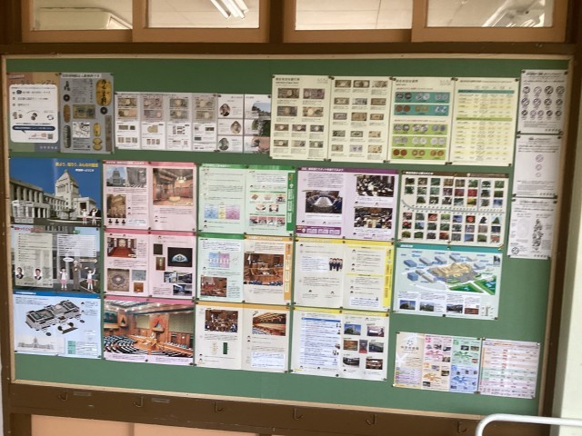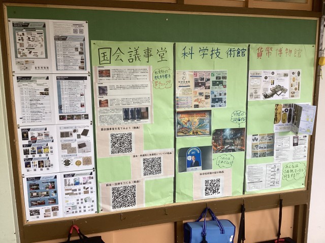 6年生が社会科見学で訪れた国会議事堂・科学技術館・貨幣博物館に関する掲示を、校内に展示しています。