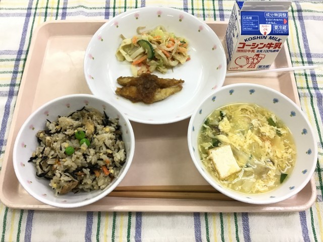 今日は和食の献立でした。ひじきごはんに短く切った「しらたき」を入れました。