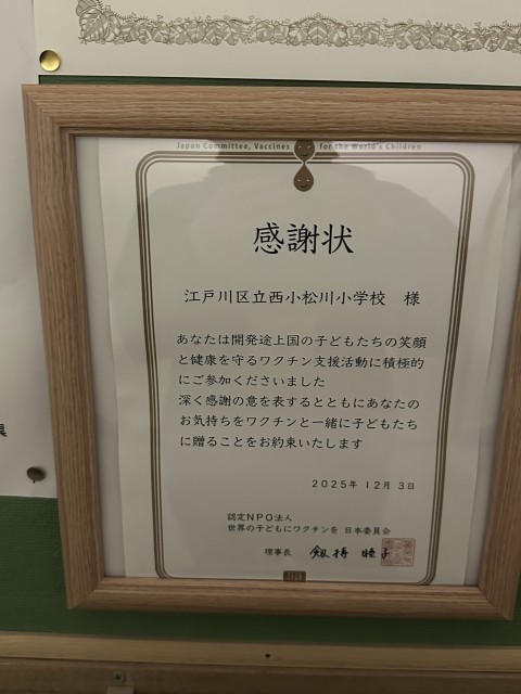 この活動が「世界の子どもにワクチンを 日本委員会(JCV)」に認められ、感謝状をいただきました。