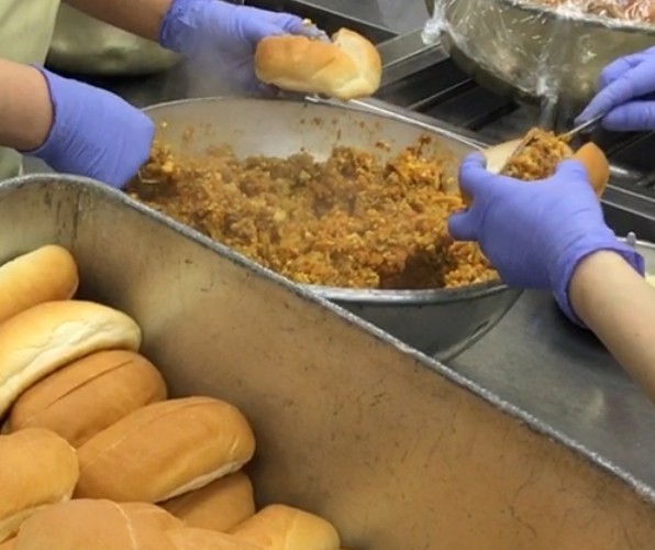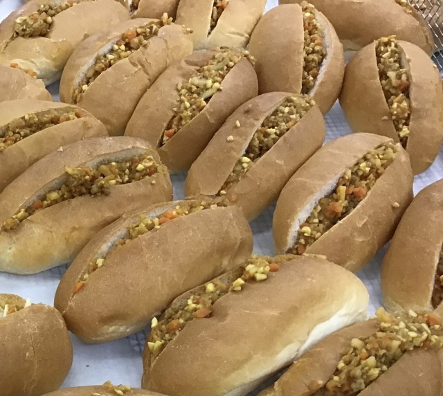 カレーミートチーズドッグは、コッペパンに切れ目を入れて、具をはさんで、チーズをのせて蒸して仕上げました。