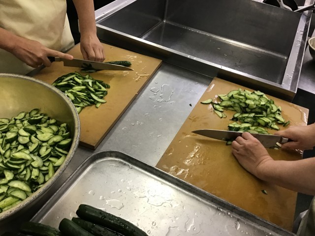 野菜を洗って、料理に合わせて切ったり、がんもどきを丸めたり、たくさんの作業を分担して進めていきます。