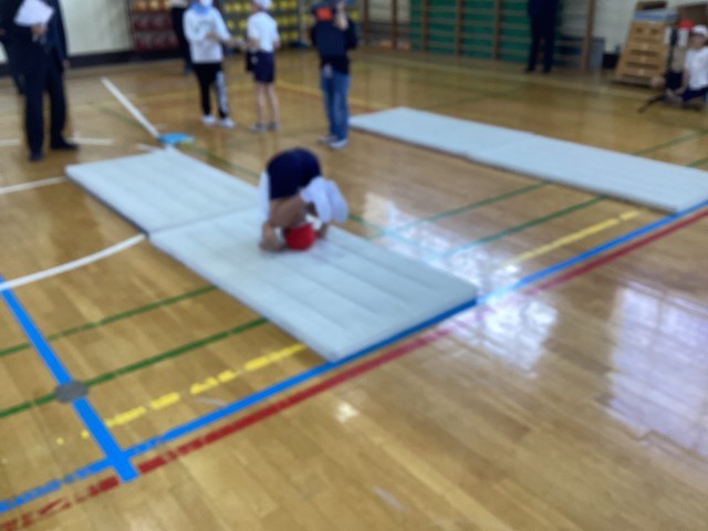 学習が始まると、前転や後転などの技に一生懸命挑戦し、自分の課題を意識しながら繰り返し練習する様子が印象的でした。