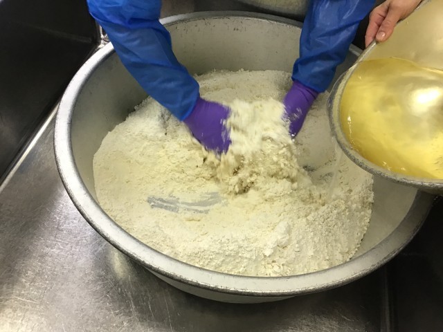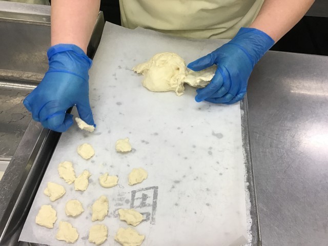 水でこねた小麦粉を手でちぎって煮て、汁に入れます。