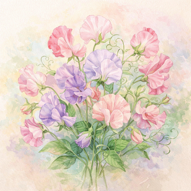 スイートピーは、やさしい色合いと香りが特徴の花で、花言葉には「門出」「優しい思い出」などがあります。