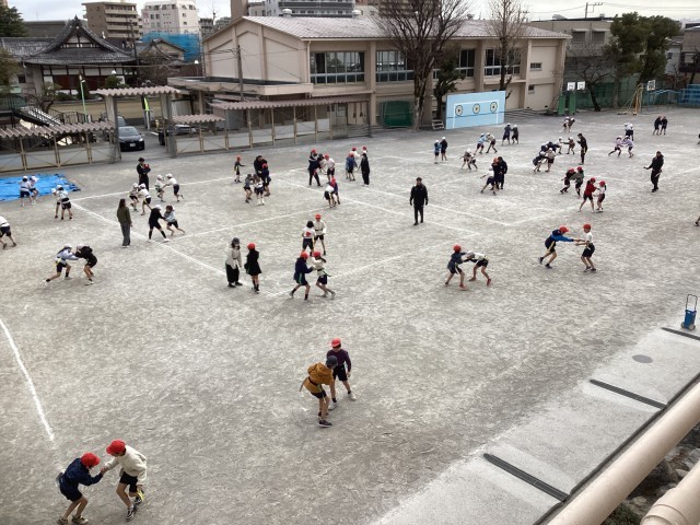 1月21日(水)3・4校時、4年生が校庭でタグラグビーを体験しました。