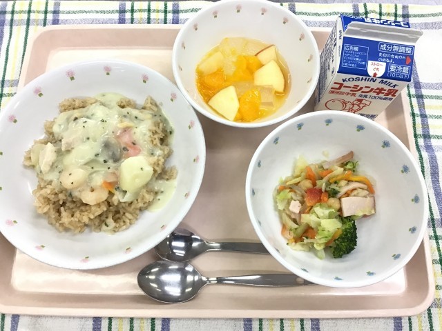 今日は、ケチャップやバターが入った、ほんのり赤いごはんにホワイトルーをかけて食べました。