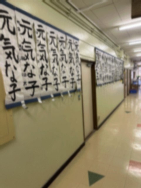 廊下には、子どもたちが書き初め大会で取り組んだ作品が掲示されています。