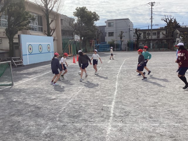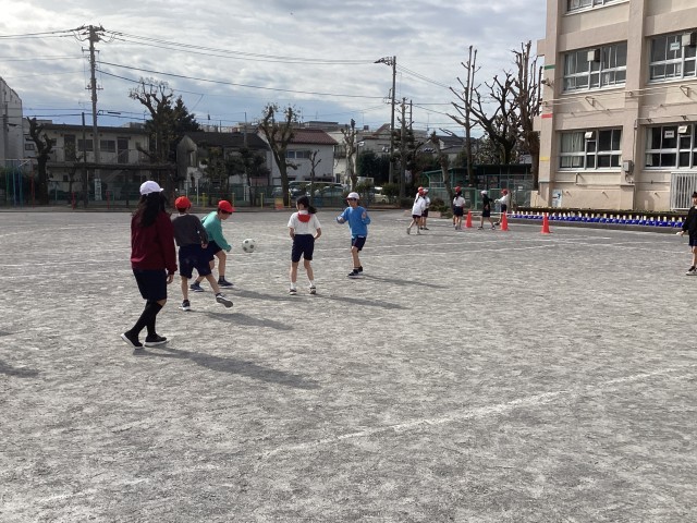 2月17日(火)2校時、青空の下、5年生が校庭で元気いっぱいサッカーに取り組みました!