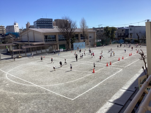 2月19日(木)4校時、2年生が体育の学習に「ボールけり遊び」に取り組んでいます。
