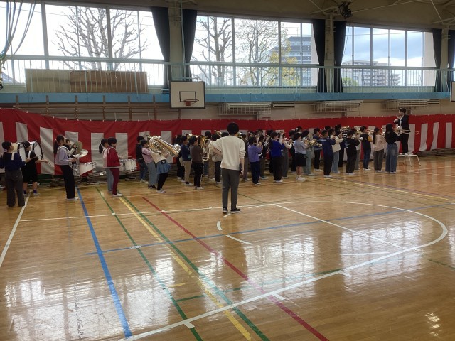 3月25日(水)朝、ブラスバンド部の子ども達が体育館で、修了式に演奏するにしこの校歌を息を合わせながら一生懸命練習に取り組みました。