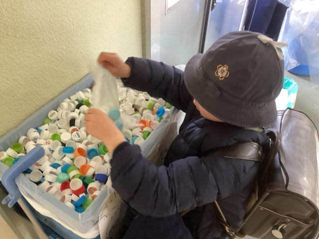 朝からたくさんの子ども達がキャップを持ってきてくれ、昇降口には大きな袋が次々と積み上がりました。