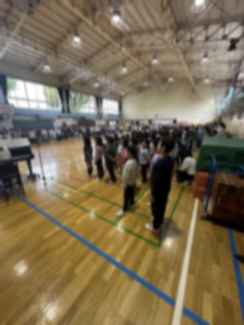 4月28日(金)朝、今年度初めての音楽朝会が開かれ、2年生から6年生までの児童が体育館に集まりました。