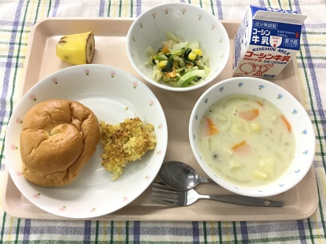 教室では、パンを自分で開いて、チキンを挟んでバーガーにして食べている子もいました。