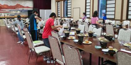 食堂の廊下では、「お腹すいたー。」と皆が行列して待っています。