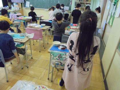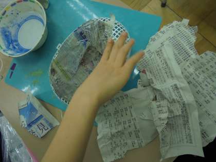 糊を溶かした水に新聞紙や様々な色のお花紙を浸して、お面の土台に丁寧に張り付けていきます。設計図通りにできてるかな??