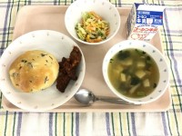 【今日の献立】手作りベーコンチーズパンレバーのマリアナソースコールスローオニオンスープ牛乳今日は手作りパンです。にしこの給食室で生地をこね、具を混ぜてひとつずつ丸めました。オーブンで焼くと、こんがり焼...