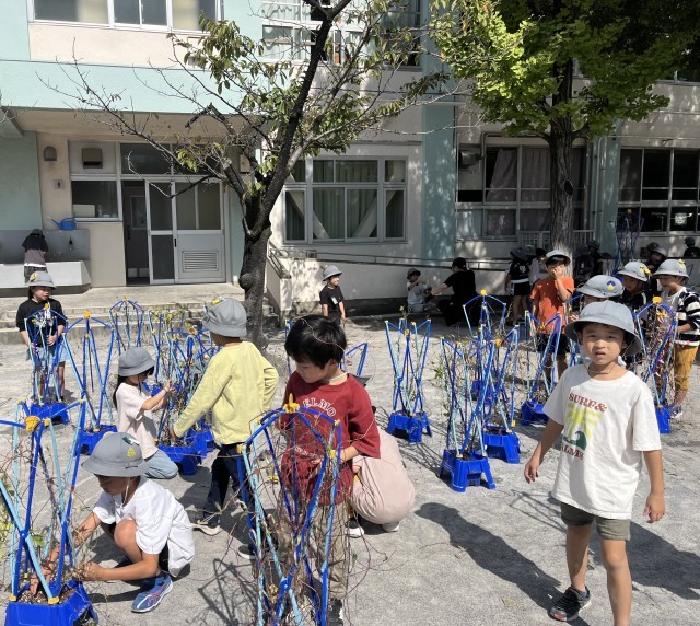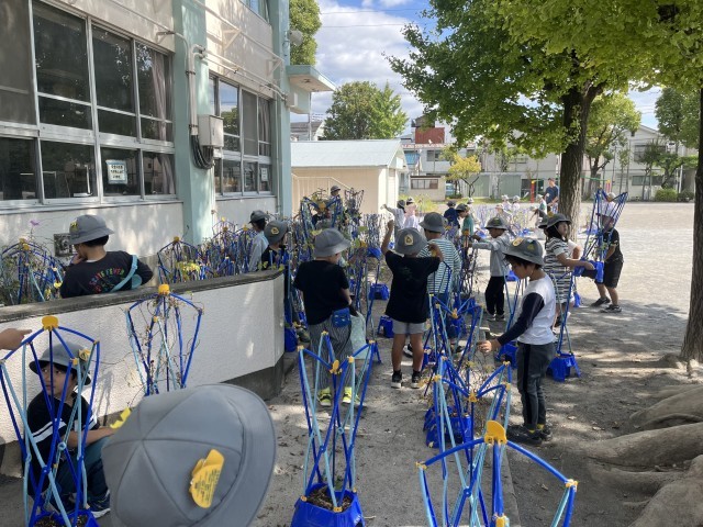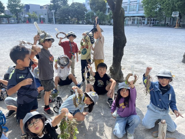 1年生は、生活科の学習で、アサガオのリース作りを行いました。とても長く伸びたツルを、丁寧に巻いてリースにしました。