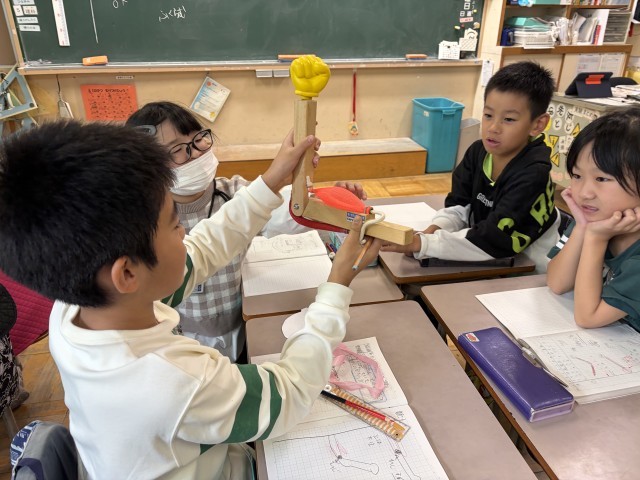 実際に模型を使って、筋肉のちぢみ方やゆるみ方を目で見て触って観察しました。