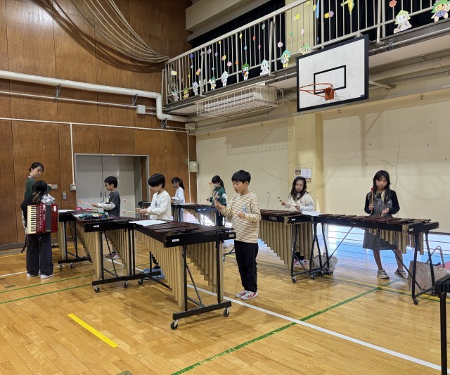 学年合同で、パートごとに顔合わせをして、リズムに合わせて演奏を