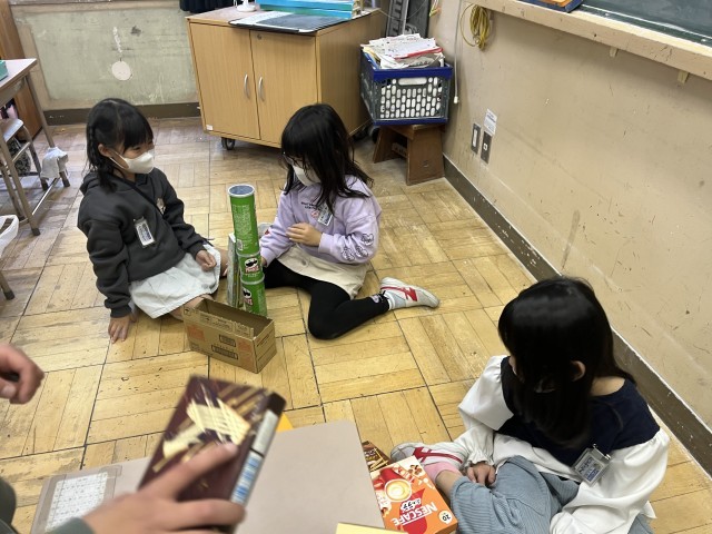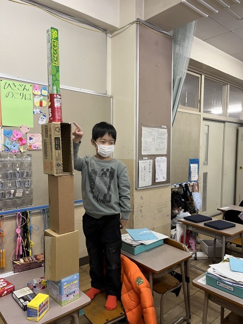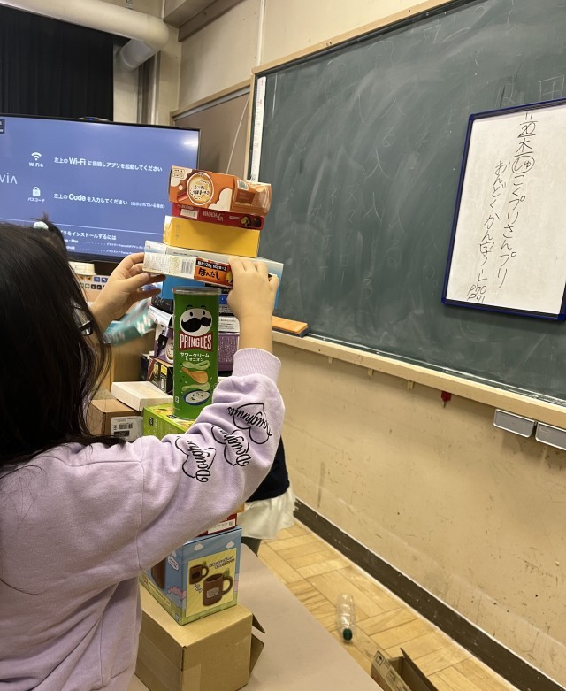 「かたちあそび」では、自分たちが持ってきた箱を使って、どれだけ高く積むことができるか、話し合いました。
