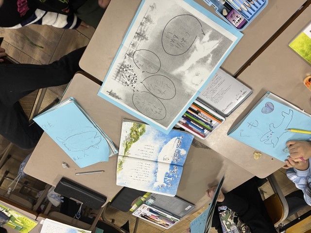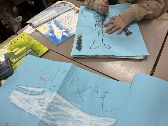 登場人物の気持ちを想像して、吹き出しをつけました。ワークシートは絵本にして、表紙をつけました。いろいろなくじらぐもの絵本ができました。