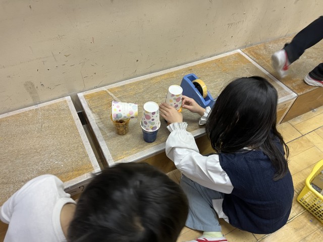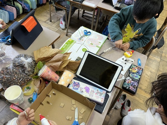 1年生は、生活科の学習で、秋のおもちゃを作りました。瀬戸口公園で拾ったどんぐりや、松ぼっくりなどを使って、おもちゃを作りました。子どもたちは、前時の学習で、自分の作りたいおもちゃを選び、材料を準備しました。どんぐりごまや、マラカス、迷路など、いろいろな秋のおもちゃを作ることができました。