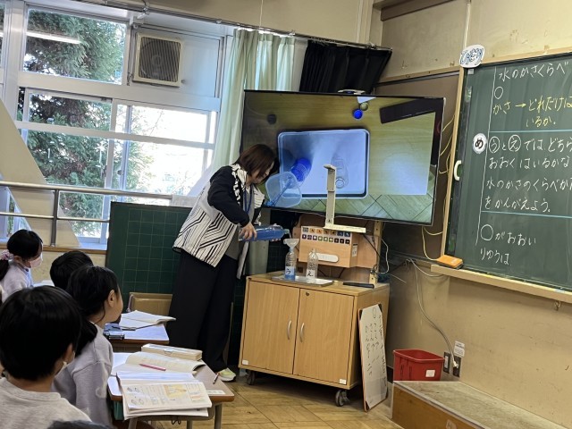 1年生は、水のかさくらべの学習を行いました。2つのペットボトルの水のかさを比べました。水のかさが多い方のペットボトルを予想をしたり、どうやったら比べることができるのか考えたりしました。理科の実験みたいで、子供達は大興奮でした!