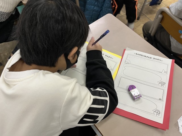 今日は、自分で作ったお話を、友達と読み合う活動を行いました。お話を読んだら、感想を書きました。