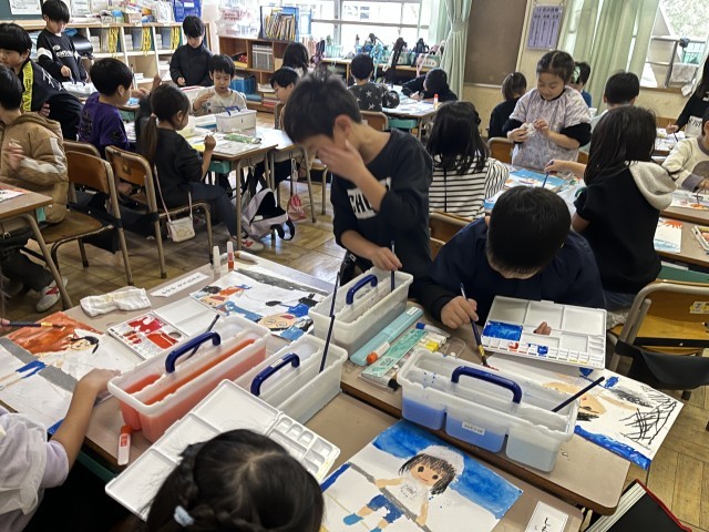 1年生は、図工の学習で、小学校での思い出に残っている出来事を描きました。学習発表会や、体育大会など、様々な行事を思い出しながら描くことができました。前回の学習で、クレヨンで下書きをしました。今回は、絵の具で背景を塗りました。素敵な作品が出来上がりましたね!