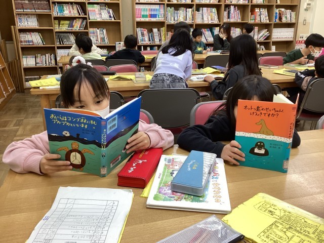 1年生の図書の時間の様子です。難しい本にも挑戦していました!
