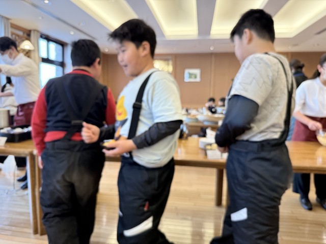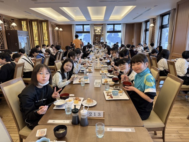昨夜はきもだめしをして、身支度してからの消灯。今日は6時に起床後、ウェアを着て、朝食バイキングです!朝からみんなモリモリ食べていました!
