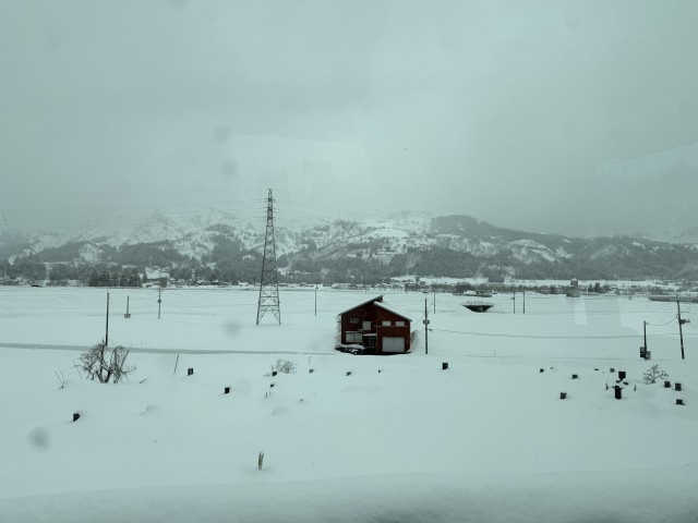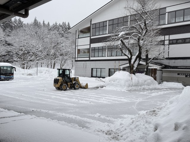 最終日の朝を迎えました。初日は快晴で暖かかったですが、昨夜から雪が強まり、外は初日に比べとても寒くなりました。玄関前で除雪してくださっています。