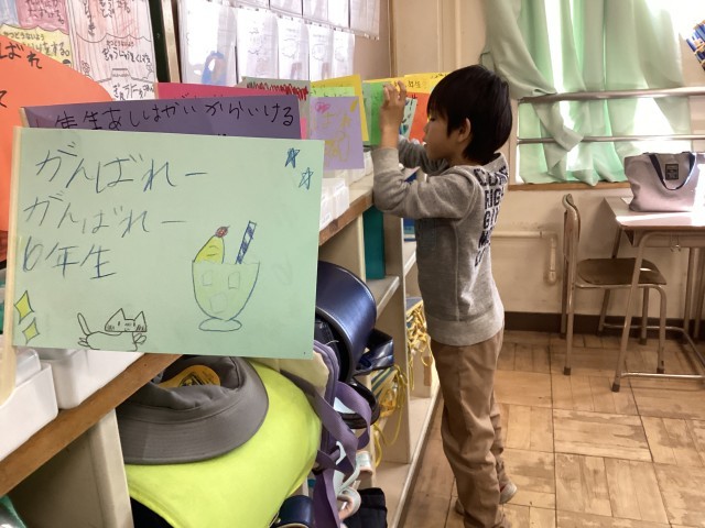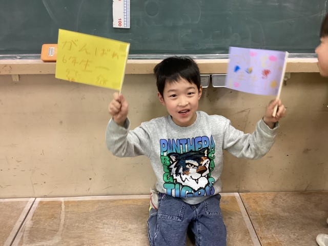 1年生は、今日のマラソン大会で、6年生を応援する旗を前日に作りました。