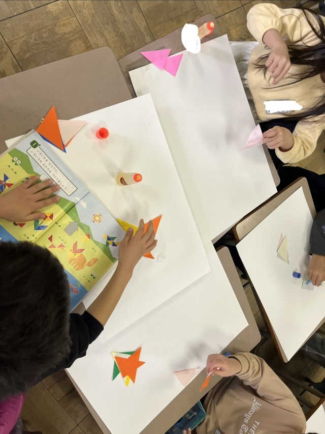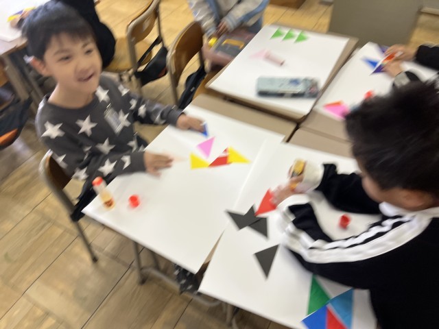 今日は、三角に切った折り紙を使って、いろいろな形を作って作品にしました。三角が何個必要なのか、考えながらできました。