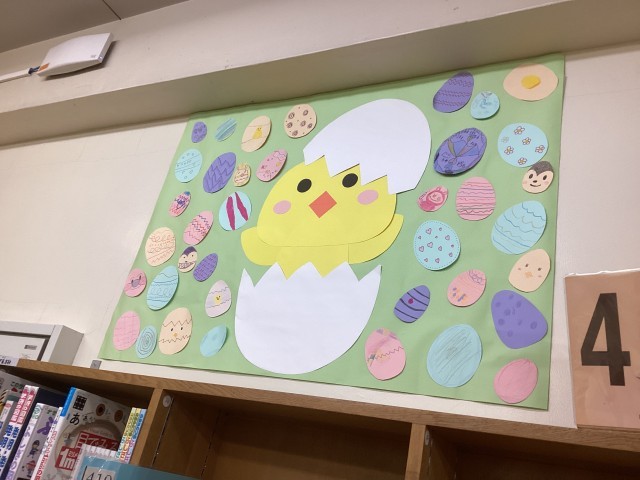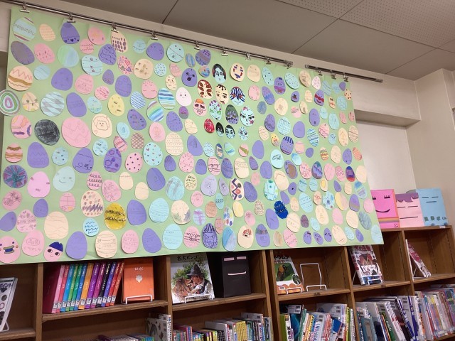 児童の皆さんが作ってくれたイースターもたくさん貼ってあります!自分が書いたイースターが見つかるかもしれませんね!