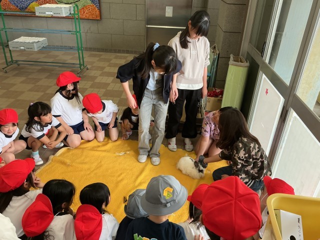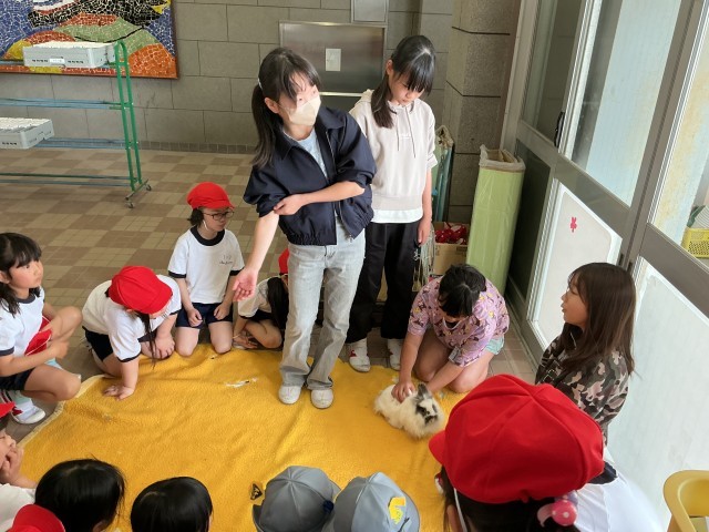 飼育栽培委員会では、ウサギのオレオの世話を交代でしています。今日は、1年生も参加してオレオと一緒に遊びました。これからも新しいメンバーで毎日世話をしていきます。