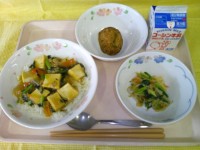 ・生揚げと小松菜のあんかけ丼・小松菜ともやしのごま和え・小松菜豆腐ドーナツ・牛乳...