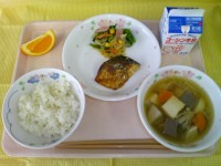 ・ごはん・サバのごまだれ焼き・菜の花の和え物・のっぺい汁・清見オレンジ・牛乳 今...