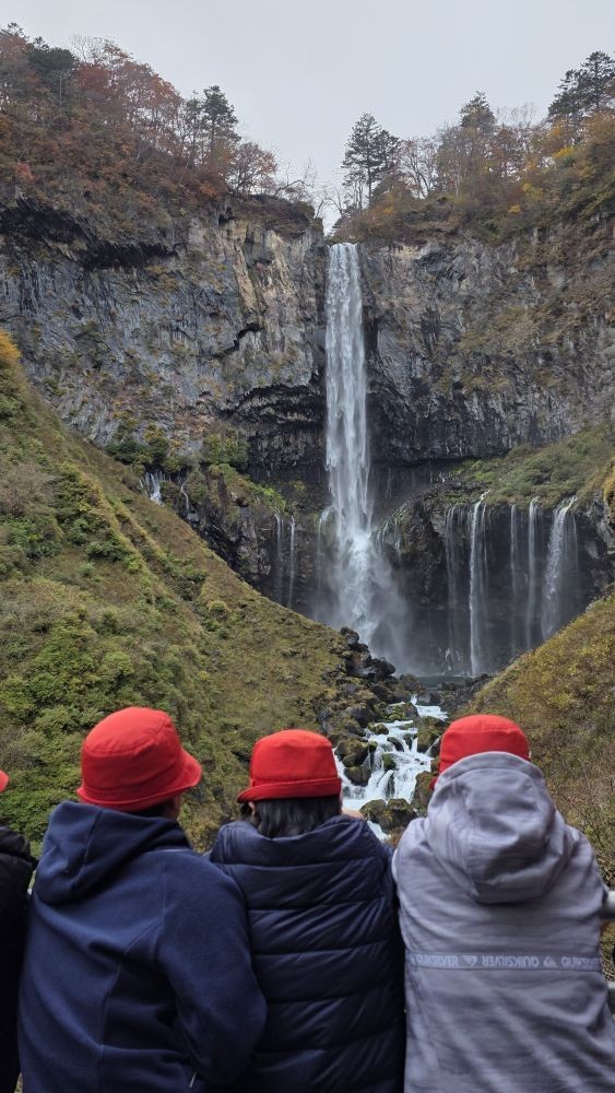 華厳の滝を見学しました。「わあ、すごい!」高さは97メートルから落下する水の壮大さに感激していました。落下する水の量は毎秒0.5立方メートルとのことです。