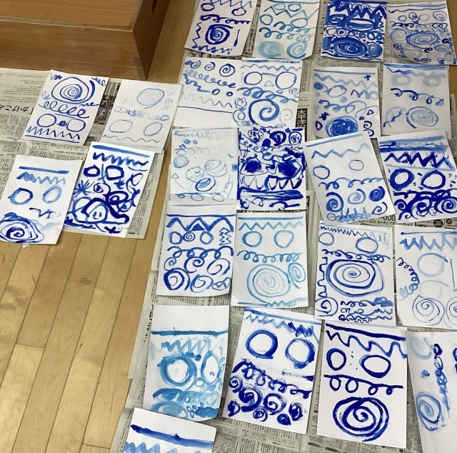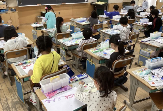 1年生は、図工の授業で『すいすい ぐるーり』をしました。絵の具を使って、線の描き方や色の使い方を工夫しながら、楽しんで取り組みました。