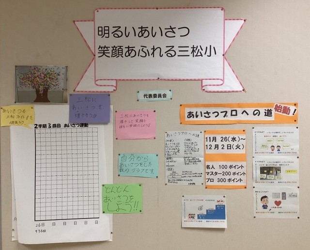 26日(水)から、代表委員会考案のプロジェクト【あいさつプロへの道】が始まりました。自分からあいさつした回数をカウントし、合格ポイントに達したらレベルアップしていく流れです。始まるにあたり代表委員の児童は、良いあいさつの例を動画にしたり各学級にポスターを配布したりして、準備を進めてきました。